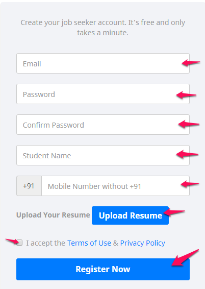 Note – अगर आपके पास resume नहीं है तो भी आप बिना resume अपलोड किये हुए भी register कर सकते हैं और चाहें तो resume बाद में submit कर सकते हैं|